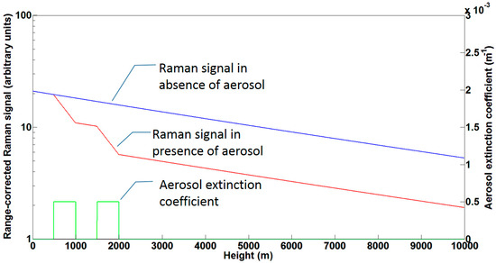 In a purely elastic lidar the aerosol backscatter coefficient and the aerosol extinction coefficient appear in an indistinguishable way—without more or less plausible further assumptions—in the expression of the received power in the term (see Section 2 for the rest of the definitions). This is all the more unwelcome as the lidar ratio relating and contains information about the physical composition and/or origin of the aerosol that one would like to measure, rather than to assume. To get over this issue and being able to determine independently the optical coefficients and , a number of solutions exist, one of the more widely extended [11,12] being the implementation of a channel measuring the backscattered radiation shifted by Raman effect from an abundant atmospheric species (N2 or O2) with well-defined proportion in the atmospheric composition. The principle lies in that, for a purely molecular atmosphere, the law followed by the molecule-specific Raman-shifted radiation collected by the lidar receiver is known, as it only depends (assuming it does not fall in the absorbing spectrum of an atmospheric gas) on the species number concentration and the molecular scattering; hence, departures from this known law can be related to the extinction introduced by the aerosols. This is illustrated in an idealized way in Figure 2. The blue curve represents the Raman return (for example from N2) if the atmosphere would not contain any aerosol, and depends solely on the number concentration of the species producing the Raman shift and the extinction originated by Rayleigh scattering. The effect of two assumed aerosol layers, one extending from 500 m to 1000 m, the other one from 1500 m to 2000 m, with aerosol extinction coefficient of m−1 (green curve) is shown in the red curve. Note that the red curve is superimposed on the blue one before the first aerosol layer is encountered, and that the separation of both curves increases only when the aerosol extinction coefficient is non-zero, the rate of the separation increase (note the logarithmic scale) being proportional to the aerosol extinction coefficient. Assuming, as is the usual case in practice, that the Raman-shifting species is N2, the Raman lidar equation takes the form: