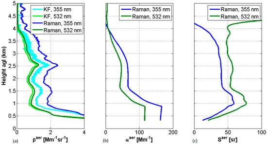 In contrast to the KF retrieval method, the Raman lidar method is able to yield reliable extinction, backscatter and lidar-ratio profiles. Equation (6) is however hampered by the derivative nature of the Raman method, which leads to noisy retrievals of the extinction coefficient and which requires the use of noise-reduction techniques such as Savitzky–Golay and range-dependent spatial filtering, among others [55,56]. Another advantage of the method is its capability to retrieve the overlap function under the assumption that [57]. Figure 3 shows an example of retrieval of backscatter and extinction coefficients at 355 nm and 532 nm with the Raman algorithm, compared with a KF inversion using a constant lidar ratio of 50 sr. The lidar ratio, the extinction-to-backscatter ratio, a product derived from the Raman inversion, is also plotted on panel (c). One sees that above 1.5 km both lidar ratios at 355 nm and 532 nm are oscillating around values close to 50 sr, a rather typical value for mineral dust [58]. The retrieval of the backscatter coefficients with the Raman algorithm look smoother because spatial filtering was applied.