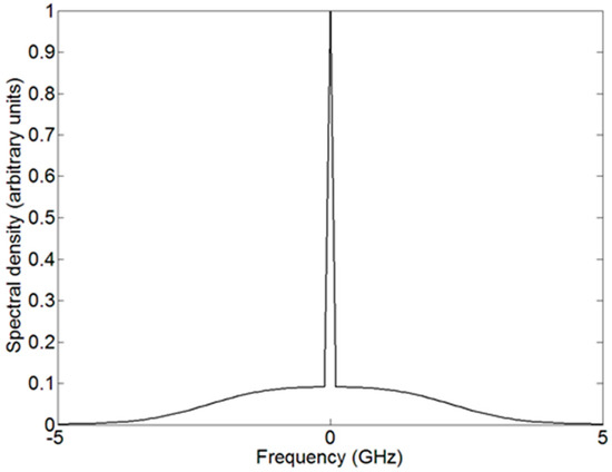 In the quest of ways for increasing the reference signal to determine the aerosol extinction coefficient, high-spectral-resolution lidars (HSRL, [60,61,62,63]) use the elastic Rayleigh scattering itself, with cross sections more than one order of magnitude higher than those of the pure rotational Raman spectrum, as reference signal (equivalent to the blue curve in Figure 2). To exploit this, the elastic return from molecules (Rayleigh scattering) must be separated from that from aerosols. This is done building on the fact that molecules are subject to thermal motion, their elastic backscattering spectrum being therefore widened by Doppler effect, while the backscatter from aerosols is much narrower spectrally. This is qualitatively illustrated in Figure 4, showing the aspect of the elastic return spectrum around the emitted wavelength. The central peak with virtually no frequency widening corresponds to the aerosol return, while the wings, extending several GHz above and below, are the return from the molecules with a Maxwell’s distribution of velocities (although other effects, such as Brillouin scattering [64], can also affect the shape of the widened molecular contribution to the return spectrum).