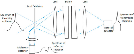 The separation needs a very selective optical filter, usually implemented with a Fabry-Pérot etalon passing the non-widened return from the aerosol and reflecting most of the widened molecular backscatter (Figure 5, [62]), or with a molecular absorption cell absorbing the aerosol backscatter. While more sensitive than the Raman one, this technique requires more complexity in the system, as the lasers must be injection seeded to achieve the necessary spectral purity and their frequency must be locked to that of the Fabry-Pérot etalon or to that of the molecular filter.