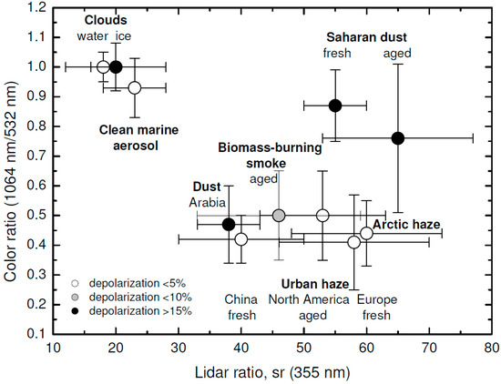 where and stand for the aerosol cross-polar and co-polar backscatter coefficients, respectively. The particle depolarization ratio, together with the lidar ratio (see Section 3.1) and the color ratio (relation between backscatter coefficients at different wavelengths) give a good approach to identify the type of atmospheric aerosol [72]. Figure 6 shows the different values for the three indicated parameters for some of the most common aerosol types found in the atmosphere.