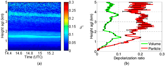 As an example, Figure 7 shows a quick look plot of the range-corrected total power and of volume depolarization ratio, both vs. time and height, measured by the UPC multi-wavelength lidar system during a strong Saharan mineral dust event over Barcelona, Spain, on 26 May 2016. While the range-corrected total power upper panel) is only able to reveal the multi-layering aspect of the low troposphere, the high values (yellow to orange/red color) of the volume depolarization ratio (, lower panel) puts in evidence the regions where dust is present. From the same event, Figure 8 shows the profiles of volume and particle depolarization ratio averaged over 1 h, starting at 14:24 UTC. Dust is present at all heights above 0.5 km. The particle depolarization ratio is quite variable since it ranges between 15% and 25% above 1 km.