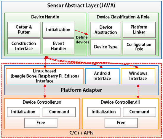 The HPA is built on a comprehensive set of C/C++ APIs, which have effective tools to control embedded systems. To develop the device driver via HPA, we can refer to the HPA interface provided for each platform as shown in Table 2. Each interface provides a robust suite of all the tools that are necessary (initialization tool, command tool, etc.). As shown in Table 2, there are three functions that must be made available for device driver development. Once driver software is produced through the interfaces, the MinT builds and creates dynamic libraries (such as .so, .dll, and .jar) for each platform. The Device Handler of the SAL performs the function of abstracting to drivers on the basis of the referred interfaces. The Device Handler is constructed as follows: