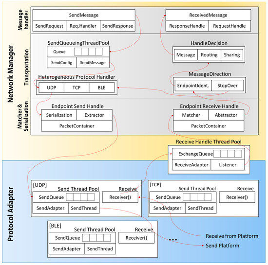 As seen in Figure 5, the Network Manager is composed of Matcher&Serialization (M&S), Transportation, and Message Handler (MH) modules. Each module has a specific role in the processing of the sent/received data. First, the M&S module analyses the packets from the received data present on the Exchange Queue. The analyzed packets are transforms into the data format for using it in MinT. After that, the packets are transferred to the Transportation module, which confirms their final destination. If the final destination of the packets is not the current object, the packets are re-transferred to the next destination. However, if the current object is indeed the final destination of the packet, the Handle Decision module analyses the purpose of the packets received. Based on the purpose of the analyzed packets, they are distributed to the Message Handler, Routing Handle, and Sharing Handle sub-modules. The Message Handler sub-module analyses the state of the transferred packets and according to it, they are delivered to the System Layer.