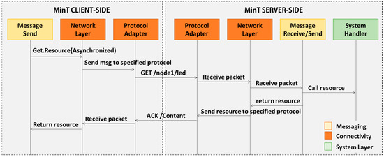Figure 6 shows the basic messaging sequence diagram used in MinT. The Send Message and Receive modules are used to accomplish transmission of data. These two modules are inherited from the Message module. The Message module is classified as the Request and Response data according to the purpose of packets. As shown in Figure 6, the request data in the client is included in to GET, POST, PUT, and DELETE messages that are RESTful API [26] and sent to the server. The server that received request data from the client send the response data to client corresponding to the request data.