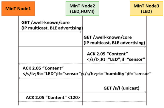 In the IoT environment, each IoT device is searching for information from its peripheral IoT devices. The Discovery module uses IP Multicast or Bluetooth (2.0, EDR, BLE) Advertise to search the peripheral IoT devices and retrieve the needed information. Figure 7 shows the sequence diagram for Resource Discovery and Resource Request in MinT. In order to search the surrounding IoT devices, the Node 1 sends a CoAP discovery (well-known/core) message to peripheral the IoT devices (Node 2 and 3) in question. According to the network protocol type, IP Multicast or Bluetooth Advertise is used for sending the message. Upon receiving the Discovery message, Node 2 and 3 in question returns their resource information as the response message. The Node 1 that receives the response message saves the resource information into its resource storage. The Node 1 on MinT uses the GET message in Unicast mode in order to retrieve the resource information from the resource storage of the target IoT devices.