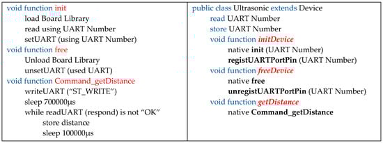 To develop a device driver for the ultrasonic sensor, the device controller must first be developed as shown in Figure 11 (left). The device controller is based on the C language to allow embedded system programming, and is developed by referring to the interface provided in Table 2, in combination with MinT. The Init function loads the device library and sets the UART number for connection of the ultrasonic sensor. The Free function disables the device library and frees unnecessary memory, such as that used for the UART connection. The Command function creates a general function to operate the sensor device; this function includes the getDistance function to obtain distance data from the ultrasonic sensor.