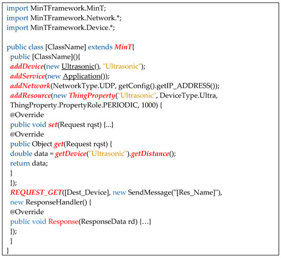 MinT aims to provide a simple and easy-to-use development kit for IoT device developers. This allows developers to develop IoT devices with minimal effort. Figure 12 shows source code used for IoT device application development, implemented in MinT. First, it inherits the MinT class and uses the MinT base middleware. MinT typically provides approximately five functions required to operate an IoT device.