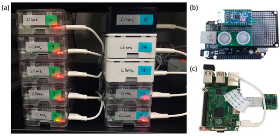 Experiment environment implemented using MinT. (a) client modules for experiment, (b) server module with ultrasonic sensor, (c) server module with camera sensor.