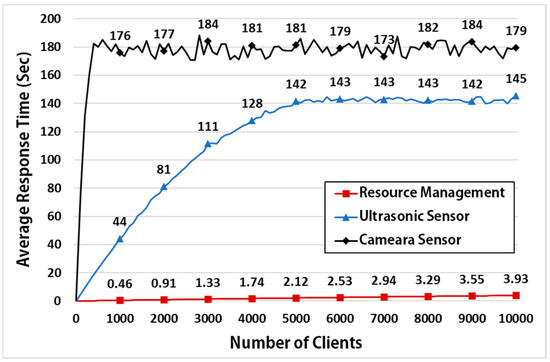 Figure 15 shows the average response time of an IoT device with an ultrasonic sensor, relative to the number of clients. In our experiment, the server was tested with up to 10,000 clients and the request cycle set to 100 ms. Because the ultrasonic and camera sensor take a minimum of 46 ms and 832 ms to measure the distance, the results shows that the average response time increases rapidly as the number of clients increases (Figure 15). However, because MinT uses resource management to control the sensor device and to manage the sensing or network data, it can respond directly with the data stored in the resource storage. Therefore, the results show that the average response time is a maximum of about 3.9 s.