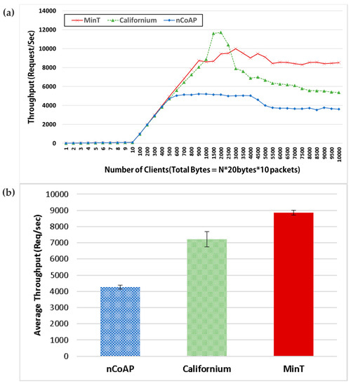 (a) Throughput and (b) average throughput with MinT, Californium, and nCoAP(SE).