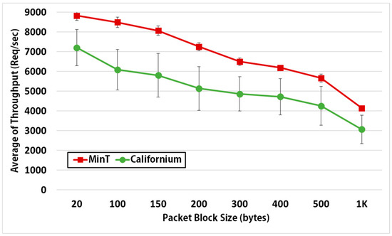 Average throughput for various packet block sizes in MinT and Californium (SE).