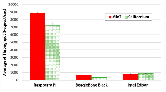 Figure 18 shows the average throughput performance on various hardware platforms for MinT and Californium. When compared to Californium, MinT shows about 19% better performance on the Raspberry Pi 3 and about 45% better on BeagleBone Black. However, MinT demonstrated about a 5% worse throughput on the Intel Edison, compared to Californium. Given the fact that both the BeagleBone Black and Intel Edison are low-end hardware platforms with low throughputs, the inferior performance of MinT on the Intel Edison need not be regarded to be of much significance. The experimental results show that MinT has the best performance on hardware platforms. As a result, we demonstrate that MinT is an efficient IoT middleware that can be utilized to achieve low transmission delays and enhanced battery life in an IoT environment.