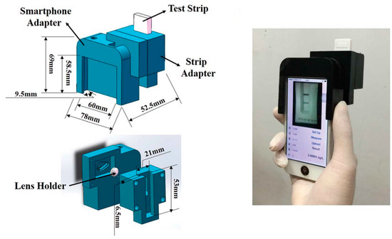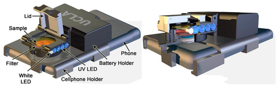 Zhu et al. [11] developed a portable Escherichia coli detection platform for screening of water and food samples. The cellphone-based fluorescence imaging platform was specifically realized to quantify the bacterial concentration in a water sample loaded into glass capillaries, opportunely functionalized with antibody directed against E. coli. Secondary antibodies, conjugated with quantum dots, were subsequently dispensed into the capillaries and served as the fluorescence signal. Quantum dots are inorganic nanocrystals with unique optical and chemical properties that give them exceptional brightness and photo-stability. In this case, UV-LEDs provided the excitation signal. The emission from the quantum dots through an additional lens was conveyed to the phone camera unit. A light-weight (~28 g) and compact (3.5 cm × 5.5 cm × 2.4 cm) attachment to the existing camera unit of a cellphone was designed to host the diagnostic platform. By quantifying the fluorescent light emission from each capillary tube, the concentration of E. coli in the sample was determined. The authors reported that the test can be completed within 2 h, including sample preparation, sample loading and incubation, with a detection limit of 5–10 CFU mL−1 in buffer solution. They also demonstrated the efficacy of this approach using fat-free milk as a matrix, where a similar detection limit was achieved. The same concept was used by Ludwig et al. [12] for the detection of the presence of anti-recombinant bovine somatotropin (rbST) antibodies in milk, which are endogenously produced upon administration of rbST, a milk production enhancer in dairy cattle which is illegal in the EU and represents a public health concern in the US. To monitor the presence of this biomarker, multiple immunoassay microspheres were used for the detection of multiple antibodies simultaneously within a small volume of a single sample. In addition to the same setup previously described, a white LED for dark-field imaging of all microspheres present in the sample was used. The cellphone-based diagnostic platform was successfully applied to milk sample extracts from rbST-treated and untreated cows. An 80% true-positive rate and 95% true-negative rate were achieved. The designed system can be adapted to any available cellphone that has a camera module simply by modifying the dimensions of the cellphone holder and 3D-printing another one accordingly (Figure 2).