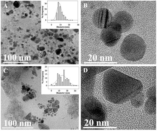 TEM micrographs of 9.1 ± 0.4 nm spherical Ag-nanoseeds (A,B) and triangular shaped 14.0 ± 0.9 nm Ag-nanoprisms (C,D) with the corresponding size distribution histograms (insets in A and C). Magnification of A = C <<< B = D.