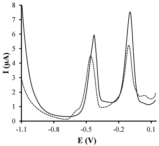 Stripping voltammetric measurements of a solution containing 100 μg·L−1 of Cu(II) and Pb(II) at pH 4.5 using an Ed of −1.1 V during a td of 120 s on Ag-nanoseeds-SPCE (solid line) and SPCE (dashed line).
