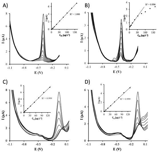 Stripping voltammetric measurements and calibration curves (insets) obtained for the individual calibration of Pb(II) (A,B) and Cu(II) (C,D) in acetate buffer pH 4.5 using an Ag-nanoseeds-SPCNFE (A,C) and an Ag-nanoprisms-SPCNFE (B,D) at an Ed of −1.1 V and a td of 120 s.