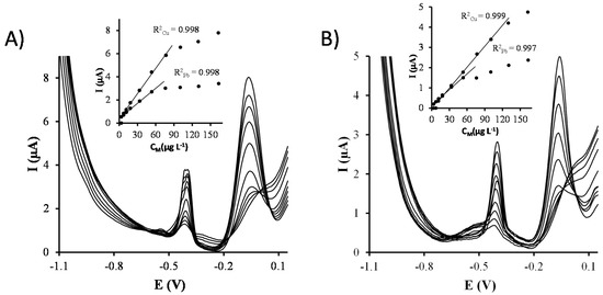 In order to see the enhancement of the electrochemical response provided by the silver nanoparticles screen-printed electrode, firstly, the measurements of a solution containing 100 μg·L−1 of Cu(II) and Pb(II) were carried out on both SPCE and Ag-nanoseeds-SPCE. As it can be seen in Figure 3, the attachment of the silver nanoparticles on the screen-printed surface considerably increases the voltammetric response for both considered metal ions, suggesting that a sensor based on the modification with Ag-nanoparticles could be a better alternative for the determination of Cu(II) and Pb(II).
