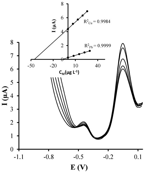 Linear calibration plots for both separate and simultaneous determinations of Cu(II) and Pb(II) were performed by increasing metal ion concentrations in 0.1 mol·L−1 acetate buffer (pH 4.5).