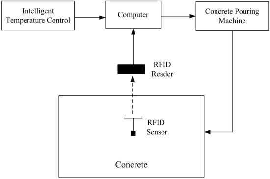 Figure 1 shows the architecture of our proposed concrete-temperature monitoring method based on an embedded passive RFID sensor tag. The RFID sensor tag is embedded in concrete for accurate temperature monitoring. The RFID reader received the temperature data from the embedded RFID sensor and then the computer controlled the concrete pouring machine based on the intelligent temperature control pattern discussed below.