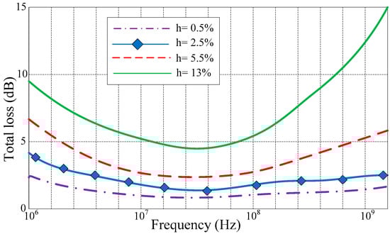 Since η1 and α are both highly influenced by humidity conditions of concrete, the transmission loss, propagation loss, as well as overall loss of electromagnetic waves penetrating concrete should be investigated at various concrete humidity conditions. Figure 3 illustrates the MATLAB-simulated results of overall loss at a depth of 0.2 m, from 1 MHz to 1 GHz. The analysis was repeated at typical concrete humidity conditions, i.e., 0.5%, 2.5%, 5.5%, and 13%. The overall loss can be obtained from the sum of the transmission loss and propagation loss. The overall loss of wet concrete (13% humidity) from about 22–82 MHz is about 6 to 11 dB less than the overall loss at either 1 MHz or 1 GHz. Hence, it can be concluded that there should be an optimum frequency with minimum transmission loss from air to concrete. However, the proposed RFID sensor tag works at 915 MHz and, according to Figure 2, the overall loss is about 12 dB.