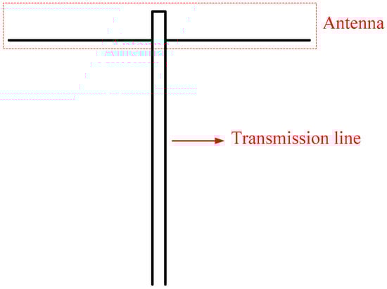 This work aims to design a RFID sensor tag to perform temperature measurement at the required depth in concrete; therefore, the design of tag antenna should take concrete’s influence on communication into consideration. From the discussion above, the overall loss of 915 MHz at the depth of 0.2 m is about 10 dB, resulting in the UHF RFID tag being hardly read from the external RFID reader. Hence, we proposed a T-type antenna design in Figure 5. Ensuring the low-cost application, the antenna design adopts a simple dipole scheme. In order to enlarge the depth of the tag embedded in concrete, the dipole antenna is connected to an extension part, which consists of two parallel transmission lines made by microstrips [31]. The dipole antenna with a 9.2 cm width is printed on FR4 substrate (dielectric constant εr = 4.4, thickness h = 2 mm). These transmission lines are designed to transmit the energy collected by the antenna to the inner part of the tag in concrete. The microstrips are insulated from both sides to prevent any degradation of the communication performance. In order to transmit all of the power received by the antenna to the sensor chip, the length of the transmission line must be a multiple of λ/2 in the medium. In this design, the length of the transmission line is 14.2 cm.