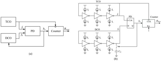 The architecture of the proposed temperature sensor is shown in Figure 6a. It developed from the phase-locked loop (PLL)-based interface theory [37] and can be divided into four blocks: a temperature-controlled oscillator (TCO), a digitally-controlled oscillator (DCO), a phase detector (PD), and a counter. The TCO is responsible for converting the temperature information into a temperature-controlled frequency ft. The DCO is used to generates a digital-controlled frequency fd, which is controlled by the PD’s output bo. PD detects the phase difference between the TCO and DCO and then generates a corresponding digital signal bo. PD combines with TCO and DCO to form a PLL loop. The counter, utilizing ft as the reference clock, is responsible for converting bo into a corresponding digital code Bsens. When the entire loop is stabilized, Bsens represents the digital value of the temperature information.