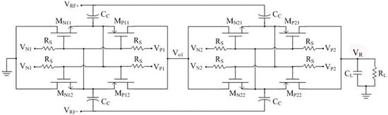 Inspired by Kamalinejad [38], a gate-boosting scheme is adopted to improve the power conversion efficiency ηr of the rectifier. When the input power is smaller (or larger) than the optimal point of the ηr curve, an extra bias-voltage can be added positively (or negatively) to promote the effective gate-source voltage of the switches. In addition, the extra bias-voltage equals zero when the input power comes at the optimal point, which means the bias-voltage is dynamic. From the above rules, Figure 7 shows the proposed rectifier is made up of two identical stages. The differential-drive switch is constituted by the NMOS transistors MN11-22 and PMOS transistors MP11-22, the gate-source voltage of which are boosted by the bias-voltage VN1,2 and VP1,2, respectively. The large resistor RS is adopted to block the AC component of VN1,2 and VP1,2. In order to avoid the large silicon area in the CMOS process, a PMOS transistor which operates in the cut-off region could replace RS.