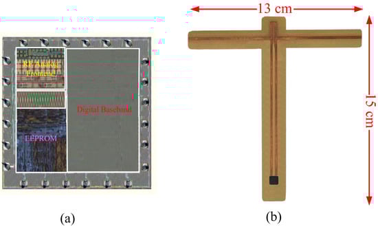 Figure 8a shows the microphoto of our RFID sensor tag chip. The RFID tag chip was designed and fabricated using the TSMC 0.18 μm 1P6M mixed-signal CMOS process. As shown in Figure 8b, this tag chip was matched with the proposed T-type antenna on FR4 substrate for the temperature measurement in the laboratory. The overall tag covers an area of approximately 13 × 15 cm2.