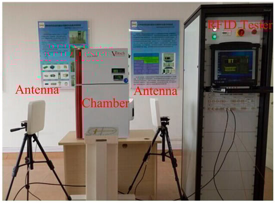 The sensor tag was firstly tested and calibrated in the laboratory, as shown in Figure 9. In order to improve the measuring accuracy, two antennas were adopted in our measurement, one was the transmitting antenna and another was the receiving antenna. The temperature calibration of the tag was performed inside a VCL4003 temperature and humidity chamber from Votsch Industry Electronics (Taichang, China). The VISN-R1200 from VI Service Network (Shanghai, China) is an RFID comprehensive test instrument from VI Service Network (Shanghai, China), which can assist in research, development, and measurements based on various RFID standards.