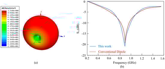 Antenna performances: (a) radiation pattern; (b) S11 performance.
