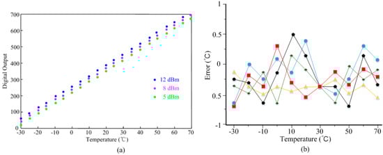 In order to test the temperature performances, the proposed sensor tag is put into the climate chamber together with an antenna of the RFID tester. The measured digital outputs of the tag at different input powers (12, 8, and 5 dBm) are shown in Figure 11a. The digital output of the tag can read from the reader. The three tests show high consistency and achieve a linearity error of less than 6%. The measured resolution is around 0.15 °C/LSB within the temperature range of −30–70 °C. Figure 11b illustrates the temperature error performances of five different test sensor tag chips. All five of the test chips are calibrated at 30 °C by adjusting the capacitance of Cm. Compared with [23,24,25], the measured temperature sensor achieves a higher temperature error of −0.7/0.5 °C within the range of −30–70 °C due to the temperature sensor design lacking a reference clock signal.
