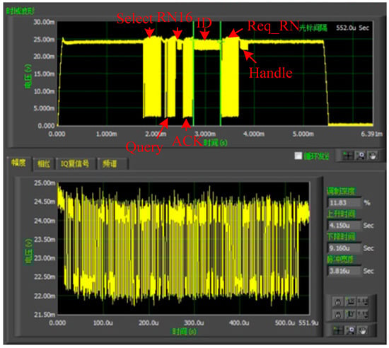 To verify the RFID communication of the proposed sensor tag, the testing parameters are chosen as follows: the operating frequency is 915 MHz, the distances between the two antennas and the sensor tag are both 0.5 m, the transmitting power is 1 W. The overall communication flow is shown in Figure 12. The RFID tester firstly sends a Select Instruction of Inventory Sequence order. After waiting for 5~6 Tari, the RFID tester then sends a Query instruction and the tag responses back with RN16. The tester then sends an ACK instruction to acquire the ID information of the tag, including the sensor data. After that, the tester sends Req_RN instruction to obtain the Handle response.