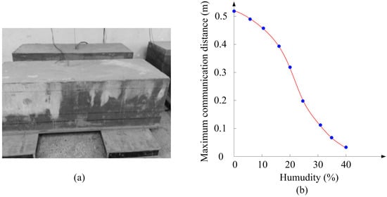 The exploited RFID temperature sensor tag is buried in concrete for temperature monitoring, so the transmission loss of the sensor tag under different humidity conditions significantly influences its performance. Thus, the transmission loss under different humidity conditions is experimentally measured. A Sensirion SHT75 humidity sensor is employed to measure the concrete humidity. As is shown in Figure 13a, the experimental concrete block is 120 × 30 × 30 cm3 and this block is composed of 50% ordinary Portland concrete and 50% sand. The SHT75 humidity sensor and the proposed RFID temperature sensor tag are all buried in the concrete, then a handheld RFID reader is placed on the surface of concrete to measure the maximum communication distance between the reader and the antenna of the sensor tag under different humidity conditions. If the successful reading ratio is more than 80%, the communication distance can be considered an effective communication distance. The measurement results are shown in Figure 13b. It can be seen that a negative correlation between humidity and maximum communication distance appears.