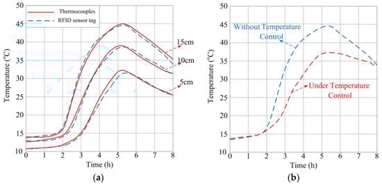 The temperature performances of the concrete during the maturation process were tested by the proposed RFID sensor. The tests were repeated when the RFID sensor was immersed at depths of 15, 10, and 5 cm, respectively. Three additional thermocouples were, respectively, placed in the same location as the references. Two hours after casting, the specimen used for testing was heated by an oven to the temperature of 50 °C for three hours, then the oven was turned off for the analysis of the cooling process of the concrete. During the heating and cooling process, the temperature was measured by both the thermocouples and the proposed RFID temperature sensor tag. The temperature measured results without intelligent control are shown in Figure 14a; it is clear that the two curves follow nearly the same profile and the maximum difference is less than 0.5 °C. Due to the internal curing process, the shallower site is easier to radiate heat, resulting in the temperature in the deeper site being higher than the shallower site. The comparison between testing under temperature control and without temperature control on the site at a 15 cm depth is shown in Figure 14b. It is obvious that the temperature under intelligent control rises and declines more gently than the temperature without control.