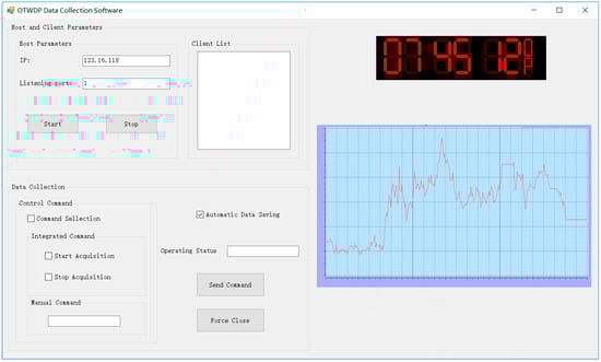 The monitoring software interface for concrete temperature is shown in Figure 15. This software interface mainly consists of four parts: a host and client parameters module, a data collection module, residual error display module, and an alarm module. The host and client parameters module is used to configure and display local and remote parameters, such as IP, listening port, and client list. The data collection module is used to select the command type or enter manual commands. The temperature display module is used to display the residual error value and curve. The alarm module is green when the temperature is within the normal range, and changes to red when the temperature is abnormal, making it easier to be identified.