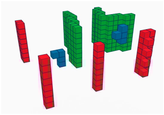 Three-dimensional assembling and analysis. Green groups: voxels in sections that do not fulfill the isolation requirements; Blue groups: voxel groups with valid sections, but without vertical continuity or enough height; Red groups: poles.