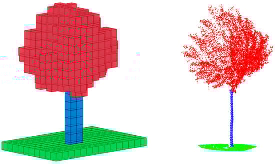Pole object extraction. (Left): group of voxels defining the actual pole (blue), linked voxels conforming the object attached to the pole (red), and voxels containing points on the ground (green); (Right): points inside each voxel group that inherit the voxel labels.