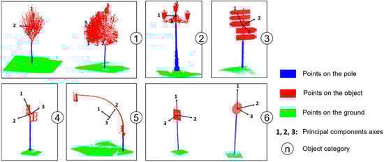 Figure 5 shows a sample of the different kinds of pole-like objects extracted from the MLS point cloud. The base is blue and the top part is red. The eigenvectors are also represented in order to show their relationship with the geometry of the objects.