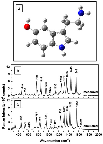 (a) Serotonin structural representation in neutral state after energy optimization. Red and blue colors were used for oxygen and nitrogen atoms, respectively. (b,c) Experimentally measured and theoretically calculated Raman vibrations of serotonin, respectively. The Raman spectrum was recorded for the standard 5-HT powder.