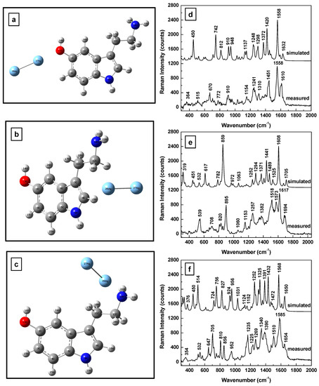 Corresponding comparisons of the theoretically predicted and experimentally obtained Raman results for each of the dimer positions shown in Figure 2a–c are presented in Figure 2d–f. The spectra are vertically translated for easier visualization and appropriately labeled. In addition to relatively good agreement between the simulated and measured Raman vibrations, as well as commonly observed Raman peaks around 1600 cm−1 for all of the above cases, these data also reveal the different signatures of the molecular interactions between the analyte and the surfaces of Ag NPs. For example, intense vibrational bands around 700 and 1400 cm−1 are observed for 5-HT physisorpted to the metallic surface through the OH of the phenol moiety, whereas a dominant vibration around 900 cm−1 is seen for serotonin interacting with silver through the NH and NH2 sites of the indole and amine functional groups in the geometrically perpendicular circumstance (see Figure 2b). For the silver dimer positioned between the hydroxyl and amine chemical groups, a multitude of strong Raman peaks are observed in Figure 2f, resembling a combination of these two previously discussed cases. The frequently observed vibration around 1600 cm−1 corresponds to the indole group’s deformation (i.e., C-H of the benzene ring and N-H stretching) and H-C-H scissoring; then, as is predictable, in all these cases hydrogen bonds are involved in the analyte interaction with the SERS metallic environment.