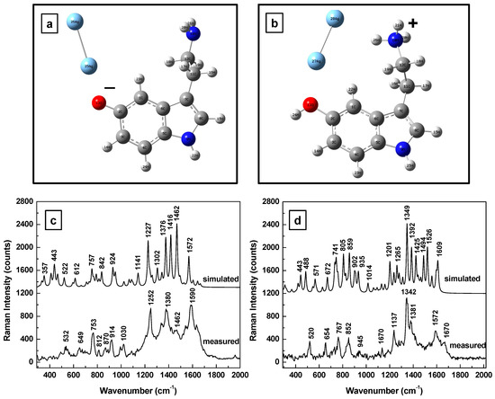 (a,b) Structural representations of the anionic and cationic forms of serotonin in the proximity of a silver dimer. (c,d) Theoretically calculated and experimentally measured Raman vibrations of the anionic and cationic forms of serotonin, respectively. The spectra are vertically translated for easier visualization and appropriately labeled.