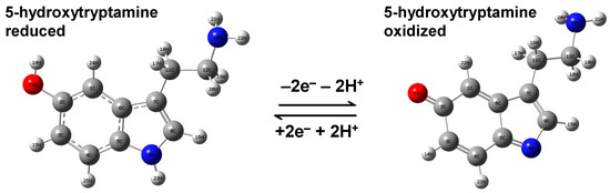 The redox process of serotonin consisting of the transfer of two electrons and two protons. The structural representations of oxidized and reduced 5-HT forms are presented and appropriately labeled.