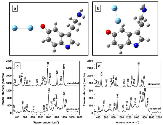 It is also worth considering and investigating the oxidized forms of 5-HT, which are known to result in a one-step redox reaction that is schematically presented in Figure 4, through the loss of two hydrogen atoms at the hydroxyl and NH chemical groups of the benzene and five member ring, respectively. These results are presented in Figure 5a–d. The reduced forms were already presented and discussed in Figure 1a–f. Again, bending of the amine chain of the oxidized form of 5-HT is observed for both configurations of silver dimer orientation, around oxygen or between the oxygen and the nitrogen atoms (see Figure 5a,b, respectively). The slightly tilted dimer position with respect to the indole plane and away from the two nitrogen atoms seen in the energetically stable configuration of Figure 5a results in the strongest theoretically predicted vibration around 1200 cm−1 in Figure 5c. A much more tilted dimer orientation is observed in Figure 5b, at almost a 45° angle to the indole plane. The predicted dominant vibration in Figure 5d at 1450 cm−1 that is scarcely found in measurements suggests that this configuration is less likely to occur; this potential adsorption process of serotonin on a silver surface through the lone pairs of oxygen and nitrogen was, however, first suggested by Song et al. [37].
