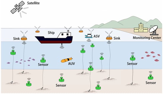 In recent years, there has been a growing trend toward smart cities. One of the most important techniques to be used is the Internet of Things (IoT), which is defined as “the infrastructure of the information society” []. To the best of our knowledge, the concept of IoT was invented in 1985 []; then, in 2012, the Internet of Underwater Things (IoUT) was first discussed []. IoUT is defined as “the network of smart interconnected underwater objects”. As shown in Figure 1, the smart objects could be different types of underwater sensors, autonomous underwater vehicles (AUVs), autonomous surface vehicles (ASVs), buoys, ships, etc. IoUT is a new class of IoT, and an important part of smart city evolution.