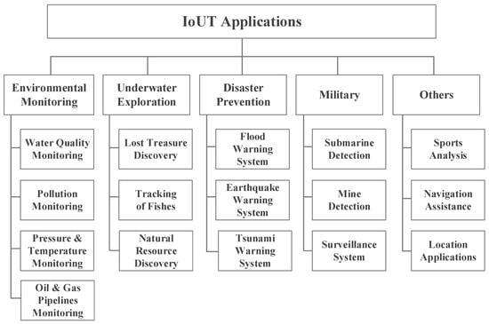 In the last decade, researchers have presented numerous practical and potential IoUT applications [,,,,,,,,,,,,,,,,,]. We classify the applications into five types: (1) environmental monitoring; (2) underwater exploration; (3) disaster prevention; (4) military; and (5) others (Figure 2).
