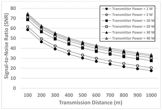 Figure 3 shows the simulation results of the SNR when the transmitter powers are set as 1 W, 2 W, 10 W, 20 W, 30 W, and 40 W. This figure plots the SNR as a function of the transmission distance. The distances are from 100 m to 1000 m.