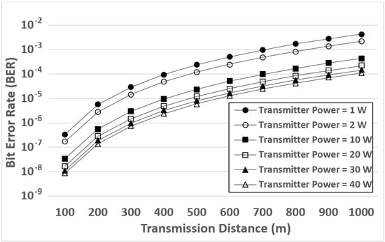 Figure 4 shows the simulation results of the BER. This figure plots the BER as a function of the transmission distance. The transmission distances are from 100 m to 1000 m, and the transmitter powers are set as 1 W, 2 W, 10 W, 20 W, 30 W, and 40 W.