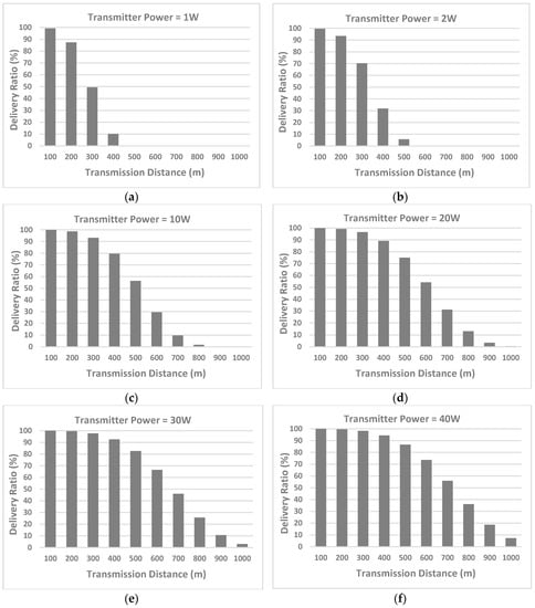 When the transmitter power increases from Figure 5a–f, we can find that the successful delivery ratio increases gradually. We take the transmission distance of 500 m as an example. For 500 m, when the transmitter powers are 1 W, 2 W, 10 W, 20 W, 30 W and 40 W, the corresponding delivery ratios are about 0%, 5%, 57%, 75%, 82%, and 88%, respectively, as shown in Figure 5a–f. The explanation is as follows. When the transmitter power is higher, the SNR is higher (as shown in Figure 3), and thereby the BER is lower (as shown in Figure 4); lower BER means lower probability of being wrong during packet transmissions. In other words, lower BER means higher successful probability of delivering packets. Accordingly, higher transmitter power produces higher SNR, and lower BER, which eventually results in higher successful delivery ratio. Note that the phenomenon occurs not only in the case of 500 m, but also in all the cases of different distances. Because the results are consistent in all the cases, the simulation results confirm that when calculating the successful delivery ratio (i.e., the reliability), our channel models are applicable to different distances.