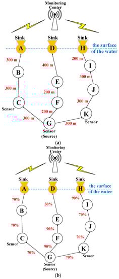 Example of the routing paths in UWSNs with: (a) the information of link distance; and (b) the information of link reliability.